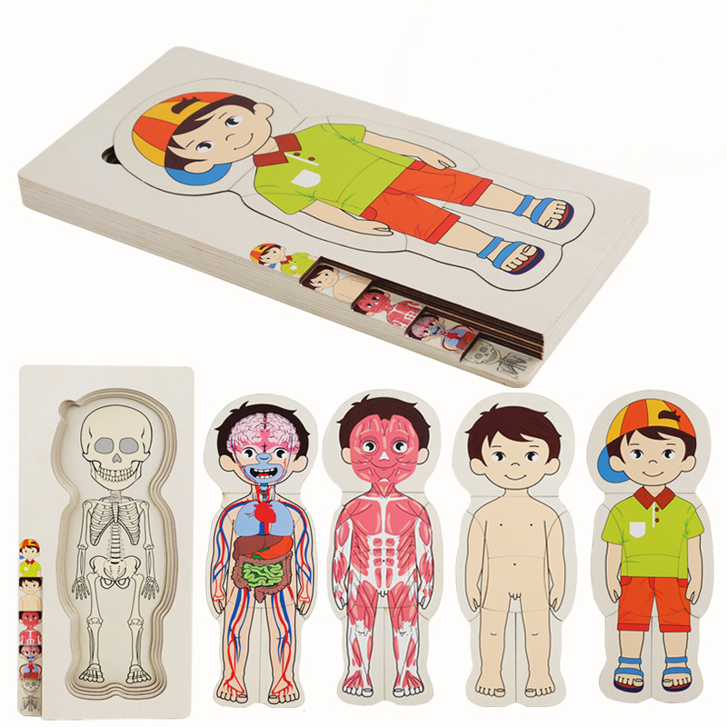 Explore the wonders of the human body with a 5-layer wooden puzzle featuring skeletal, respiratory, digestive, and muscular systems